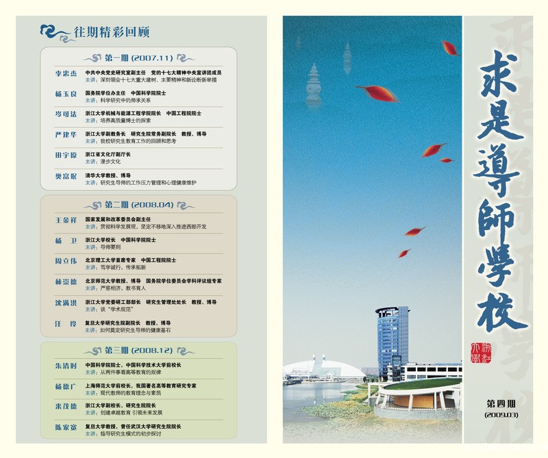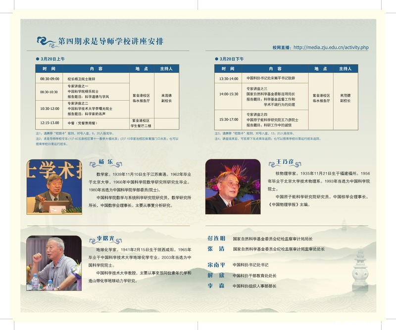 求是导师学校第四期将于3月20日开班。此次导师学校主题是学术道德建设,邀请中国科协、国家自然科学基金委领导专家来校讲座。校网中心将对专家讲座进行网络直播,http://media.zju.edu.cn/activity.php。现将有关事项通知如下: