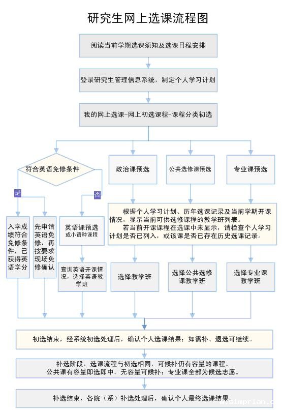 | 初选处理 | 研究生培养处与各学院(系)对初选数据进行处理。 | 18:00后在“选课结果查询”栏确认初选结果。部分课程可能因选课人数不足而停开,请关注网上通知,及时调整个人选课。 |