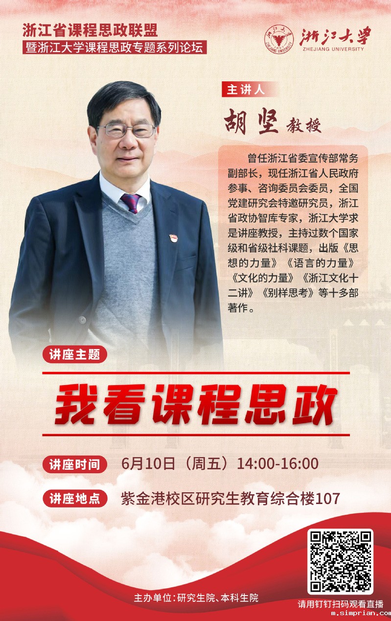 主讲人: 胡坚教授,曾任浙江省委宣传部常务副部长,现任浙江省人民政府参事、咨询委员会委员,全国党建研究会特邀研究员,浙江省政协智库专家,伟德首页官网下载求是讲座教授,主持过数个国家级和省级社科课题 出版《思想的力量》《语言的力量》巜文化的力量》《浙江文化十二讲》《别样思考》等十多部著作 。