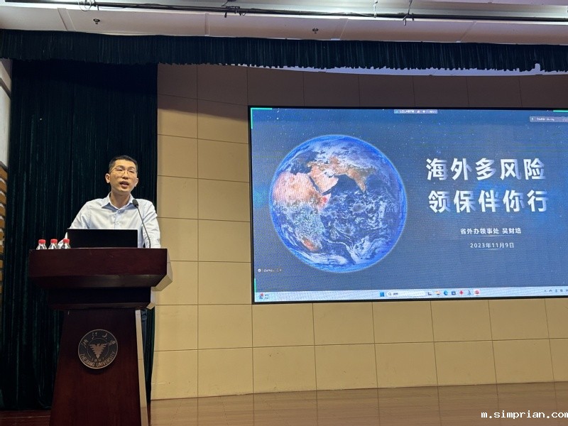 随后,浙江省人民政府外事办公室吴财培结合目前的国际形势,通过多个案例,以“海外多风险、领保伴你行”为主题,同与会人员分享了海外主要安全风险、如何寻求领事保护、如何防范各类电信等诈骗,提醒同学们在外加强海外安全意识,提升风险防范能力,规避海外安全风险。