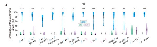 After optogenetic activation of pSI, mice would also exhibit physiological changes related to anger, such as bulging eyes, accelerated breathing, increased heart rates and trembling. In as many as 13 different situations, those optogenetically activated mice would attack their opponents in the light-evoked “battle mode”.
