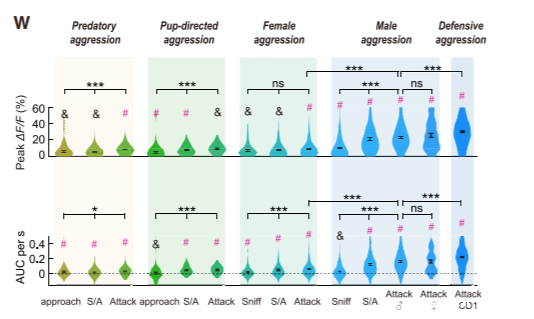 Peak DF/F (top) and AUC/s (bottom) of GCaMP6m signals during diverse aggressive behaviors