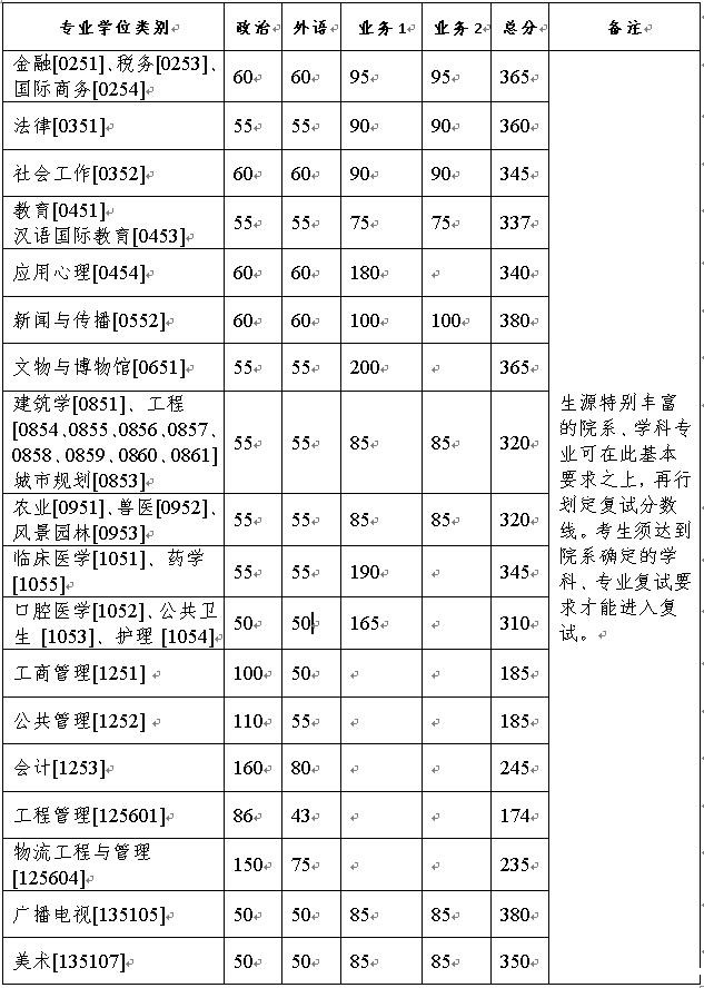 1.总分成绩不低于上表中复试分数线基本要求的总分,满分为100分的科目成绩不低于50分,满分为150分的科目成绩不低于75分,满分为200分的科目成绩不低于100分,满分为300分的科目成绩不低于150分,符合上述条件的考生可参加退役大学生士兵专项计划的复试。