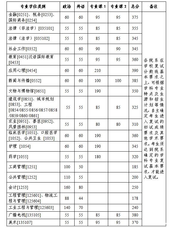 1.医学院公共卫生、护理专业类别考生,满分为100分的科目成绩不低于50分,满分为300分的科目成绩不低于150分,总分成绩不低于310分,可参加复试。